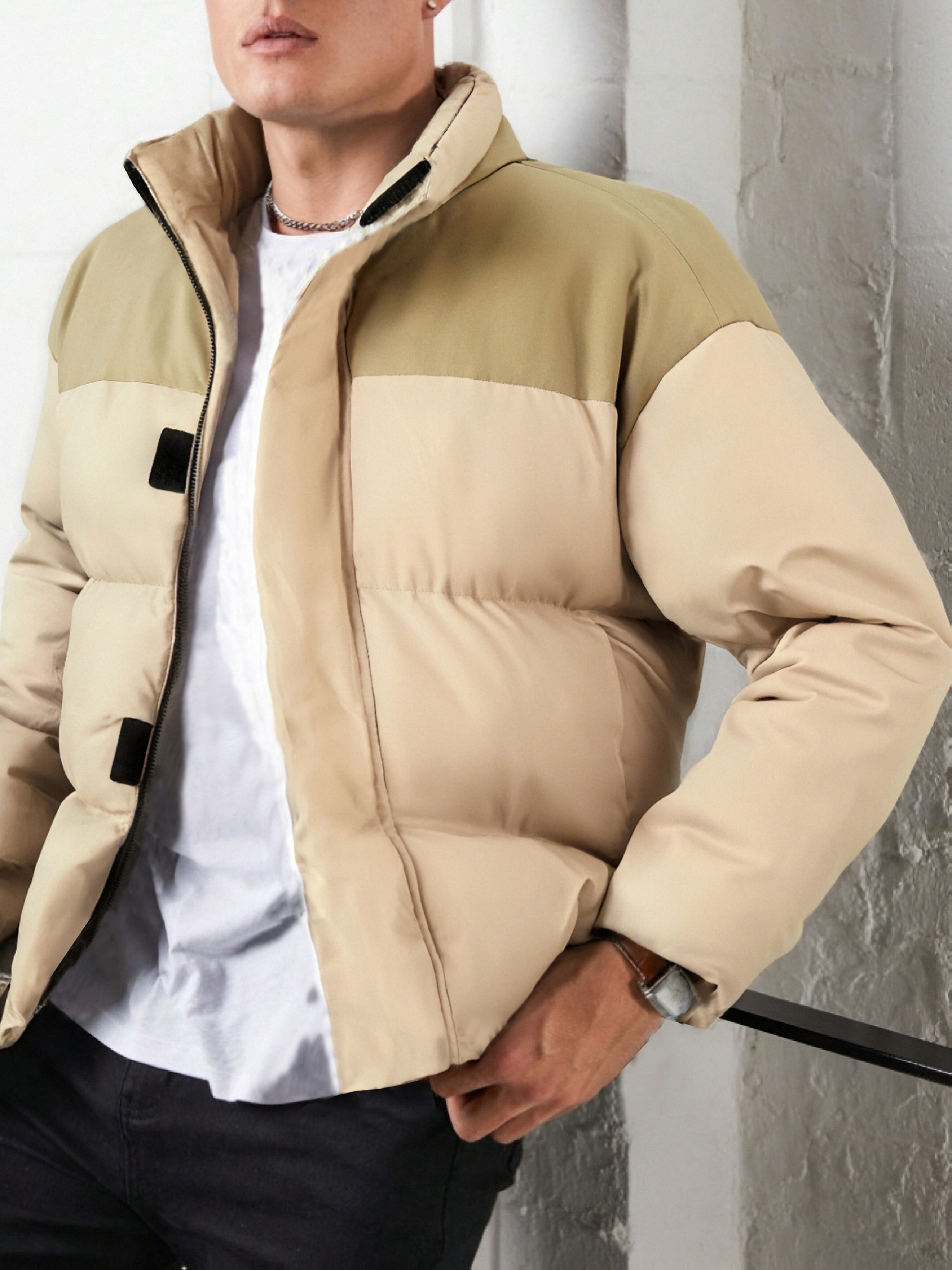 [Men's Winter Jacket] Polyester-Filled Men's Winter Jacket - Black & Casual Outdoor Warm Coat with Stand Collar, Regular Fit for Cold Weather, No Stretch Fabric