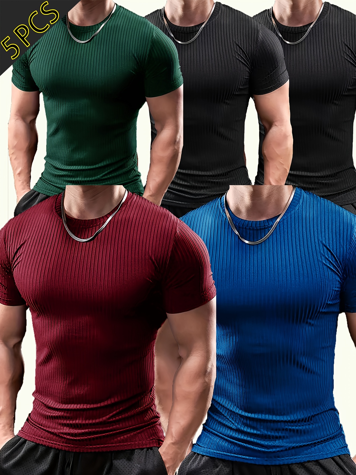 5pcs Men'S Short Sleeve Ribbed Knit T-Shirts - Breathable & Comfortable, Casual Solid Color Crew Neck Tees for Spring/Summer, Lightweight Polyester Blend, Perfect for Casual Attire, Spring Summer Apparel | Casual Style | Comfortable Fit