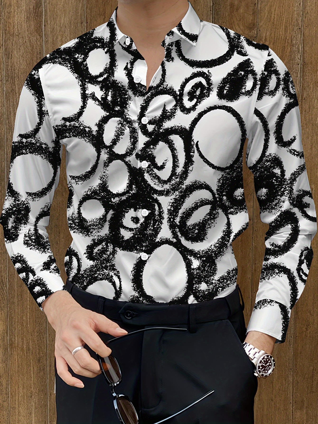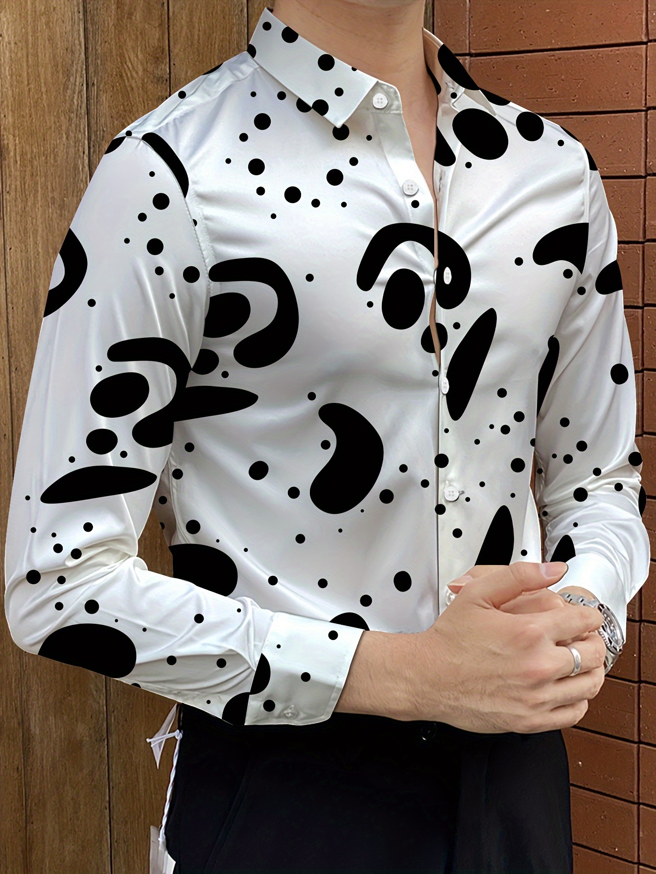 [Elegant Style] Men's Formal Dress Shirt - Sleek White with Modern Black & Gray Abstract Print, Polyester Blend, Non-Stretch, Button-Up with Lapel Collar, Ideal for All Seasons, Formal Attire|Classic Buttonup|Sleek Tailored Fit