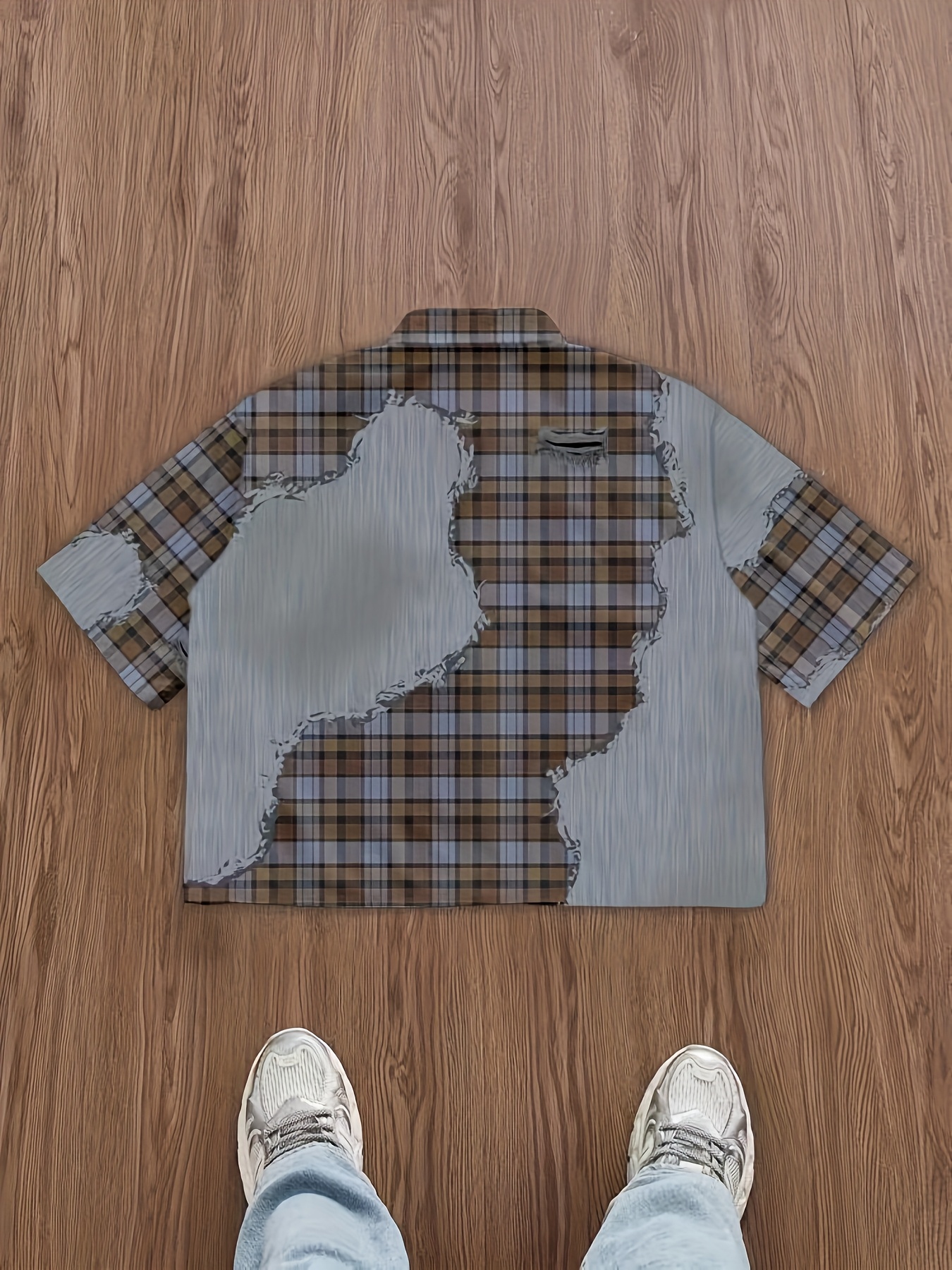 Men'S Casual Plaid Patchwork Short - Brown & White Checkered Pattern, Loose Fit Streetwear Style, Non-Stretch Fabric, Perfect for Camping & Casual Attire, Camping Apparel | Checkered Pattern Shirt | Nonstretch Fabric, Compression Shirt for Men, Gym